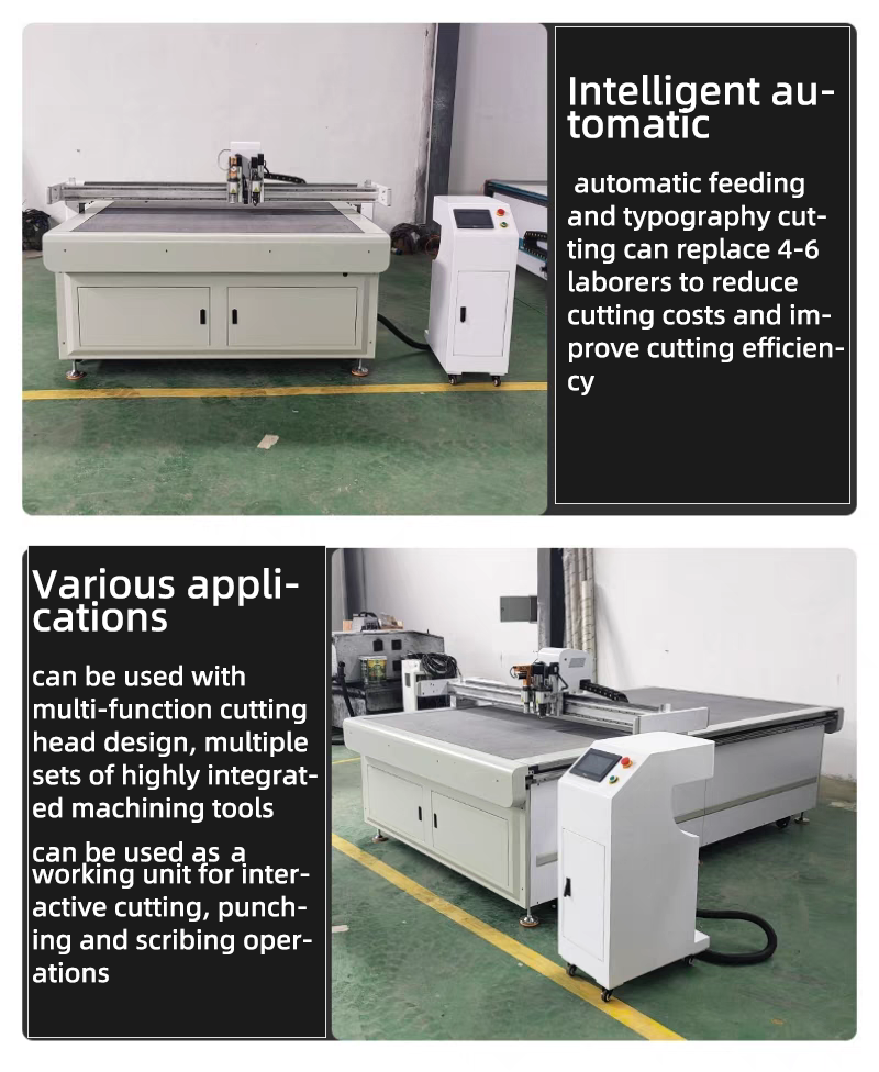 2513 Vibration knife cutting machine Product description: CNC Oscillating Knife Cutter is a type of CNC cutting machine which is used for high-precision cutting of heavier flexible and semi-rigid material.CNC Oscillating Knife Cutter is also called CNC Oscillating Knife Cutting Machine, Oscillating Knife Cutting Machine. CNC oscillating knife cutting machine is carried on the multi-tool cutting head-Vibration knife,Oblique knife, Circular knife, Punching knife, Milling knife,Punch roller and Marking pen.CCD camera and Projector are optional for more precise cutting.