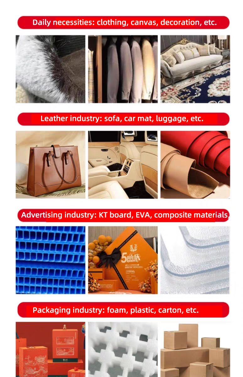 CNC Oscillating Knife Cutter is used for cutting Leather, Gasket, PP, PE.EVA, PTFE, ETFE, Carpet, Carton, Wood, MDF, PVC, Acrylic, Carboard, Rubber, Corrugated box,Foam, Leather strip, Composites,Cardboard, Corrugated board, Honeycomb paper, Plastic film,Fiber paper, Plastic box, Rebound rubber, Rubber cloth, etc. CNC Oscillating Knife Cutter is widely used in Sign and Graphics, Digital Printing, Packaging,Automotive, Recreational boat, Exhibits and Fixtures, Sign Making,Gasket Materials, Arts andCrafts and other industries.